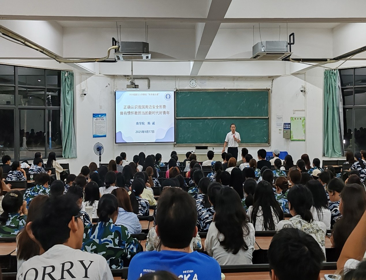 授课以学习习近平总书记在纪念中国人民抗日战争暨世界反法西斯战争胜利80周年大会上的重要讲话精神为切入点,重点分析了深刻认识国家安全的重要性、我国周边环境的基本情况,以及周边环境安全问题给我国带来的巨大影响。授课主题鲜明,内容丰富,案例生动、典型。授课最后要求全体新同学,要强化忧患意识,自觉增强底线思维,坚持国家利益至上,厚植家国情怀,把“国之大者”装在心里,把“青年之为”落在实处,在维护国家安全核心利益问题中展现责任与担当,成长为既眼里有光又脚下有力的新时代好青年。